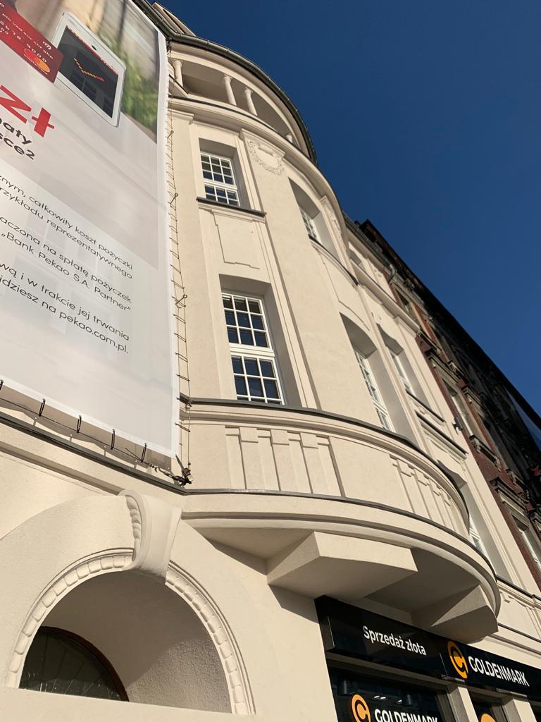 Zakres prac obejmował: Kompleksowy remont elewacji wraz z uzupełnieniem i naprawa elementów sztukaterii, wymiana i konserwacja obróbek blacharskich wraz z orynnowaniem.