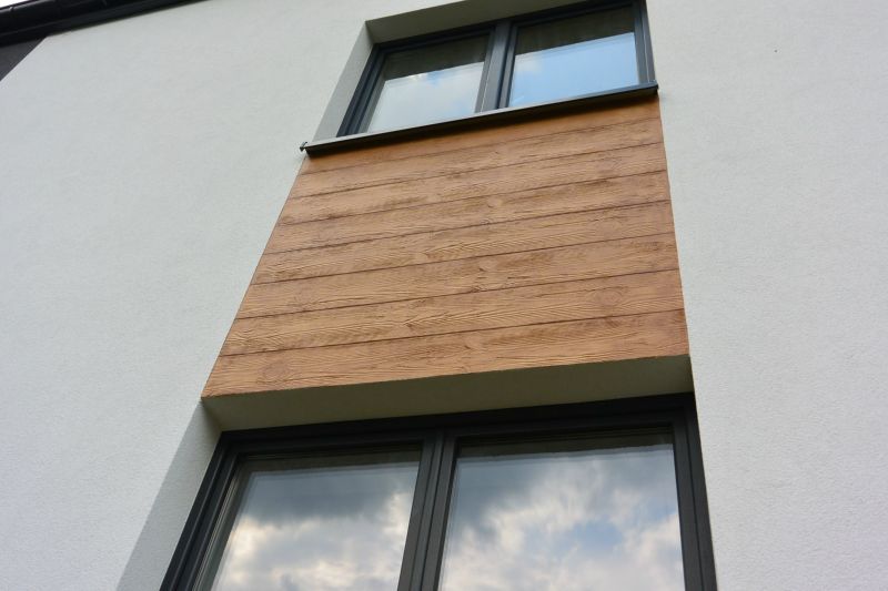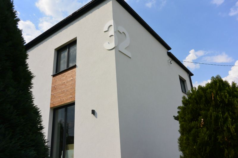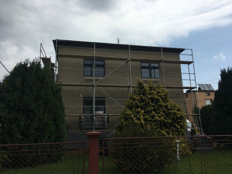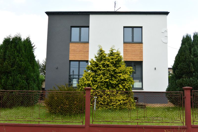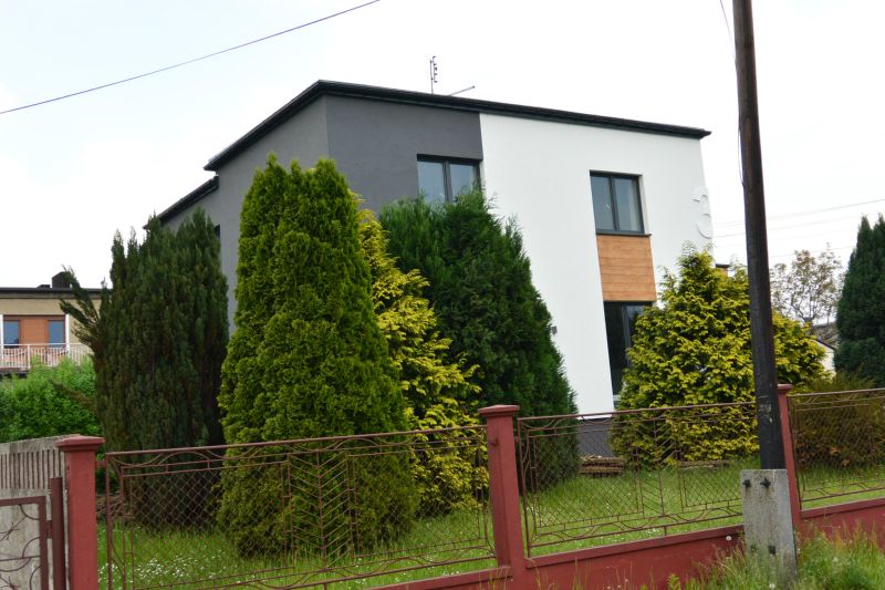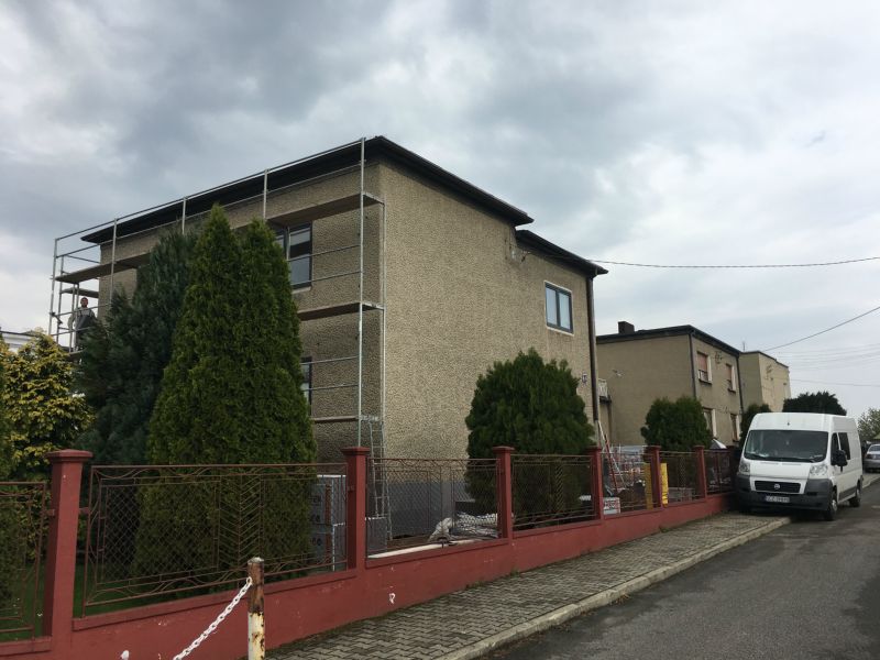 Termomodernizacja w ramach Programu Ograniczenia Niskiej Emisji w Piekarach Śląskich. Połączenie szarości, bieli oraz imitacja deski elewacyjnej.